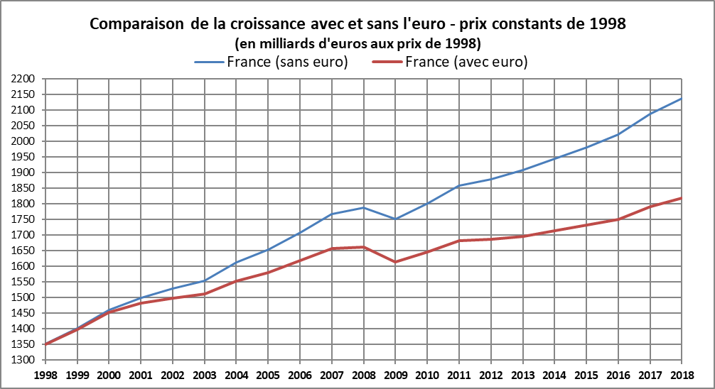 J.S : L’Euro a joué un très mauvais tour à l’économie française. En liant la parité de sa monnaie à celle des autres pays européens, il l’a défavorisée (par rapport à l’Allemagne ou au Pays-Bas) alors même qu’il avantageait l’Allemagne qui, sans l’Euro, aurait eu à affronter une forte hausse de son taux de change. C’est ce qui explique largement le fort excédent commercial de ce pays. L’Euro a ainsi handicapé l’économie française par rapport à ses partenaires immédiats. Mais, de plus, l’Euro s’appréciant par rapport au Dollar étatsuniens à partir de 2002, il a fait subir à l’économie française un fort choc de compétitivité vis-à-vis des pays extérieurs à la zone Euro. C’est ce qui explique l’effet de freinage sur la croissance que l’on constate.