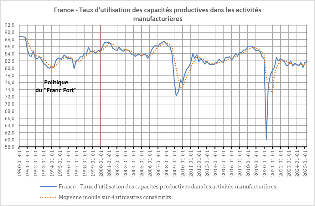 En France, les gouvernements successifs ont cependant choisi de maintenir une politique budgétaire expansionniste pour compenser l’impact de l’Euro sur la croissance. Ceci a permis à la France de ne pas trop souffrir de la mise en place de l’Euro mais avec pour conséquence l’envol de la dette publique. Et pourtant, en dépit de cela, l’économie française a néanmoins souffert. La croissance du Produit Intérieur Brut (PIB) qui était en moyenne supérieures à 2,5% à la fin des années 1990 baisse autour de 2% dans les années qui suivent l’entrée en vigueur de l’Euro puis, même en tenant compte de l’effet de la crise de 2008-2010, tombe vers 1%. L’Euro a donc placé l’économie française dans un contexte de très faible croissance. Or, la France, qui maintenait jusqu’à la crise de la COVID-19 des gains de productivité importants et qui se trouve dans une situation démographique plus expansive que ses voisins, a besoin d’un taux de croissance d’environ 1,4% pour créer des emplois. Dans l’industrie en particulier, les efforts pour amener la France dans les critères de la Monnaie Unique, puis la mise en œuvre de l’Euro ont provoqué une dépression importante.