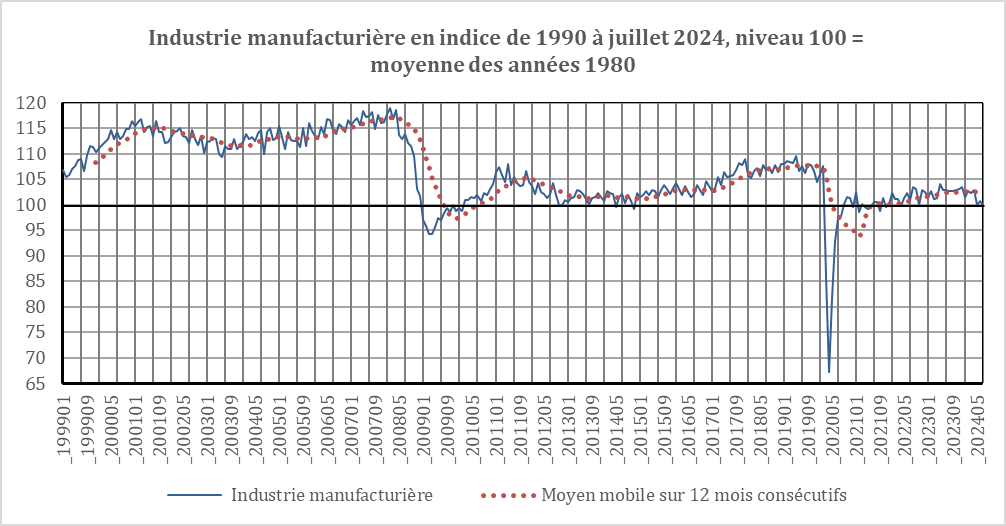 Le niveau de janvier 1990 ne fut retrouvé qu’à l’été 1997. La croissance de la production industrielle de 1997 à l’été 2001 fut modérée, et largement due à des exonérations de prestations sociales accordées par le gouvernement. Ces exonérations passent de 6,3% du montant total en 1998 à 9% en 2002. Elles ne cesseront d’augmenter par la suite, preuve que la France connaît bien un problème de compétitivité, pour atteindre à la veille de la crise financière plus de 10% et près de 24 milliards d’euros. Or, la production industrielle n’évolue plus de 2002 à 2007. De fait, en juillet 2008, à la veille du déclenchement de la crise dite des « subprimes »22, la production industrielle n’a progressé que de 3 points (de 111,5 à 114,5) par rapport à 2001. Elle s’effondre de fin 2008 à l’été 2009 et n’a toujours pas retrouvé son niveau de 1990 à la fin de 2015. Quand survient la crise de la COVID, la production industrielle, au mieux, ne retrouve pas son niveau de 2019. On constate que nous sommes aujourd’hui revenus au niveau moyen des années 1980.